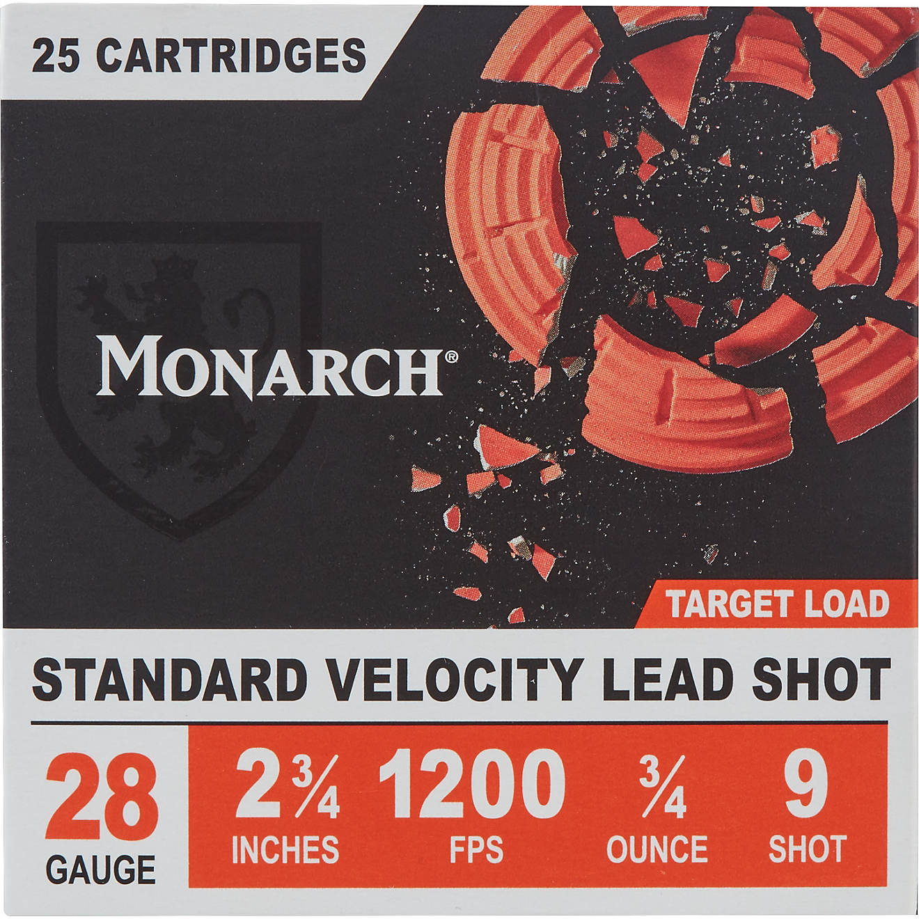 Improve your performance at the range with the Monarch Target Load 28 Gauge Shotshells. These shotshells are designed with a heavy payload, hard uniform lead shot and 1-piece wads for consistency when breaking clays. 1,200 feet per second velocity. 25-round box.