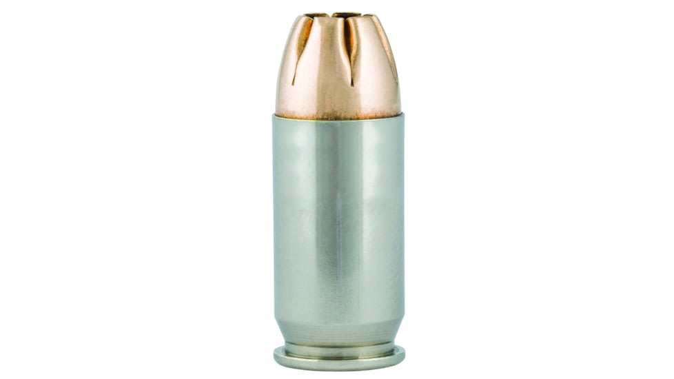 The round consists of a 210-grain bonded bullet, nickel-plated brass casing, clean-burning propellant, and non-corrosive primer. This composition ensures consistent ballistic performance while maintaining firearm cleanliness.